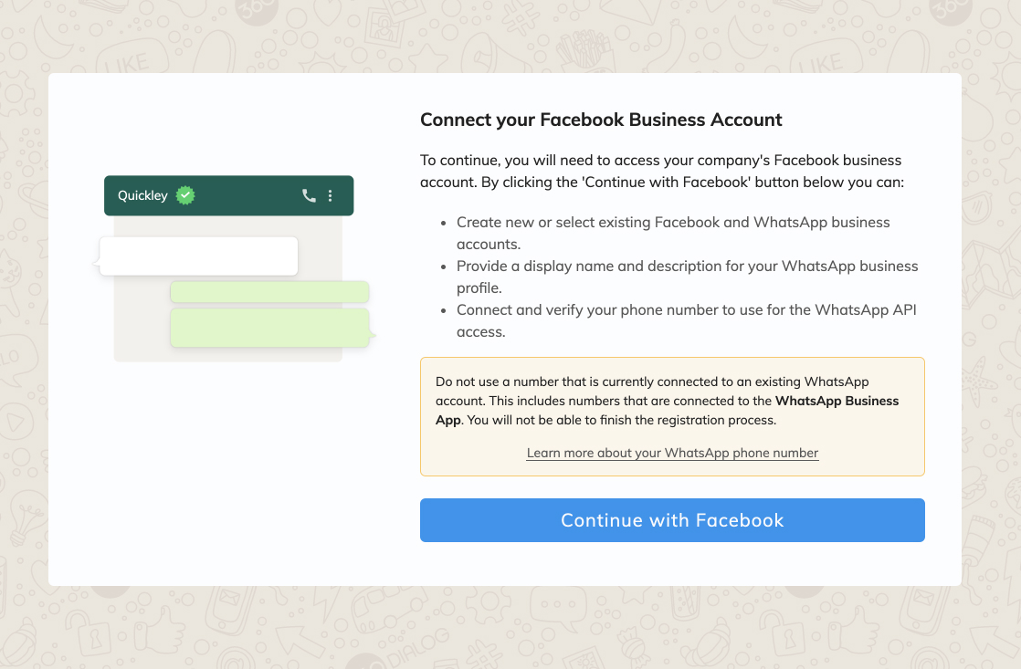 In order to activate WhatsApp Business API with your phone number, you need to submit a special application with our third-party service provider—360dialog. Once the application is approved, you will gain access to the 360dialog client’s hub, which is a simple and convenient place to manage your WhatsApp Business API connection. 360dialog is a third-party provider that we’ve officially partnered with in order to provide WhatsApp Business API services through Quickley.